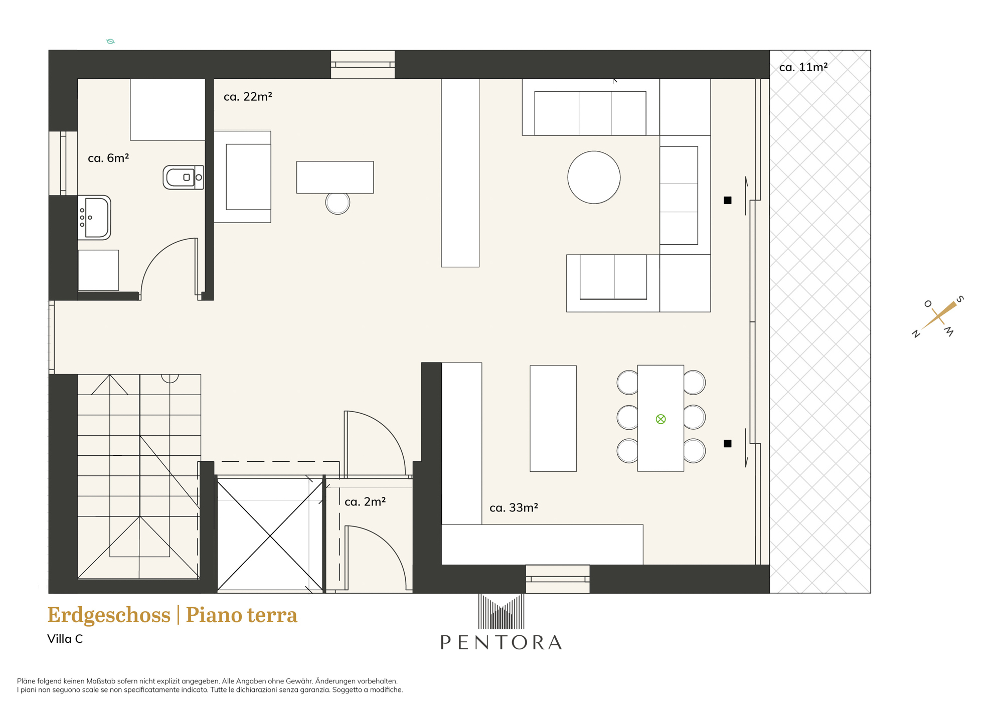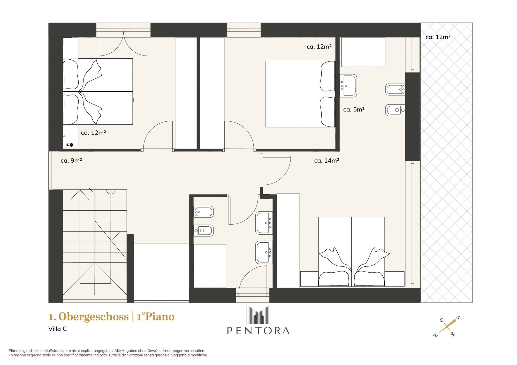 Eingeteilt in Wohnzimmer mit Küche, 3 Zimmer, 2 Bäder und WC
