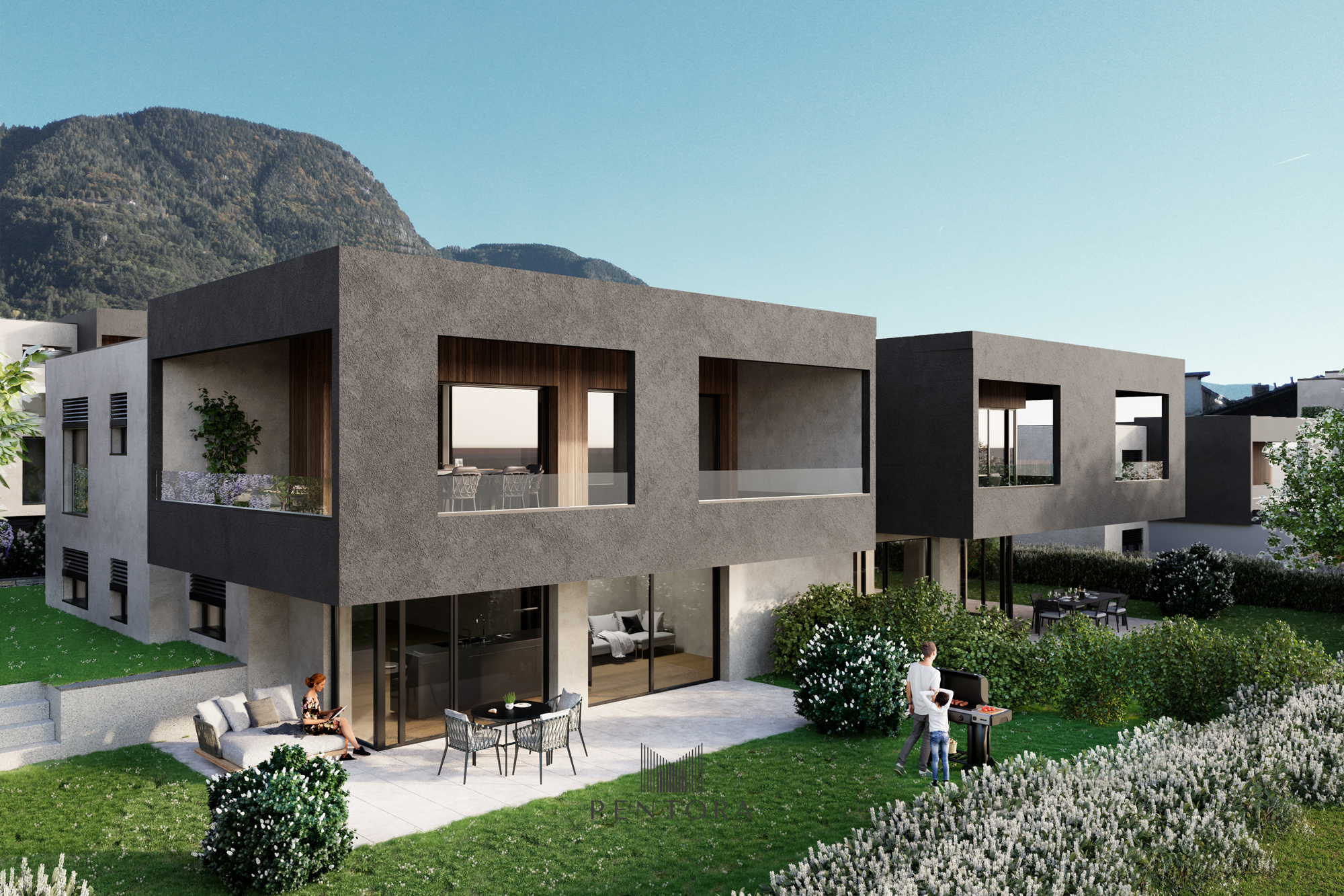 Die terrassenförmige Anordnung auf verschiedenen Höhenniveaus sorgt für maximale Privatsphäre. Die ideale Süd-westausrichtung lässt die Räume im natürlichen Licht erstrahlen und schafft eine helle, einladende Atmosphäre. Hier trifft durchdachte Architektur auf zeitloses Design, umgeben von einer sehr ruhigen Umgebung.